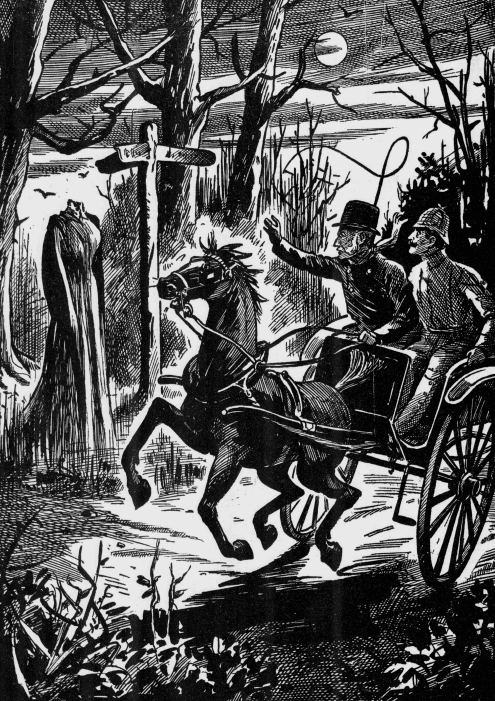 The farmer called out, ‘Hullo there! Move on, please!’ However, the strange figure made no answer and did not move. As they drew closer they saw to their horror that the figure, wrapped in a black cloak, was that of a headless woman. At this moment the horse also caught its first glimpse of the phantom and stopped paralysed with fear and trembling violently.