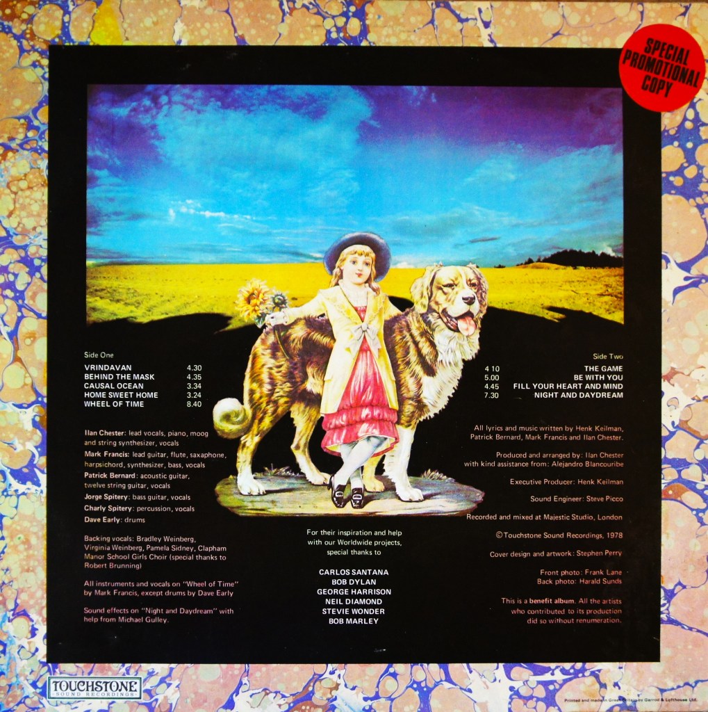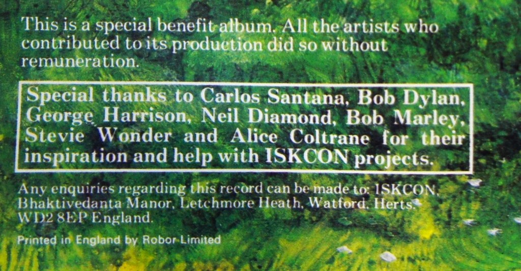 The album sleeve stated it was a benefit record, and the artists who contributed did so without payment. The sleeve specifically thanked Carlos Santana, Bob Dylan, George Harrison, Neil Diamond, Bob Marley and Stevie Wonder. I can’t have been the first punter who assumed that the music on the record was played by a supergroup consisting of all those musicians. It wasn’t. Combinations of these names appear on most Krishna rock record sleeves.