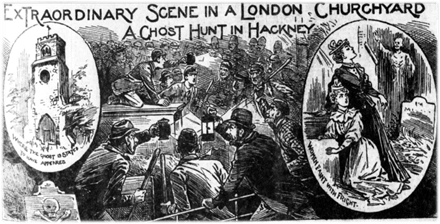 The story of the actor and the ghost has the mob waiting outside the churchyard gates and too scared to approach the ghost, but this is highly unrealistic. The ghost hunting hordes were much more likely to run amok among the gravestones, pranking each other and howling like banshees as they enjoyed some supernatural drunken fun and games. Police would often lose control as more and more curiosity seekers and revellers would turn up on subsequent nights having heard about the previous evening’s high-jinx. For an example, see the image below of a ghost flash mob in Hackney in 1895, as depicted in the Illustrated Police News.[iii]