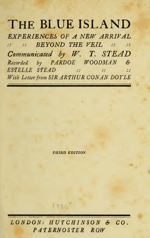 Of course, given Stead’s interest in Spiritualism, the ghost-botherers just wouldn’t let him rest in peace. Stead supposedly wrote a book from beyond the grave called The Blue Island: Experiences of a New Arrival Beyond the Veil, in which he detailed his adventures in the afterlife to Spiritualist medium Woodman Pardoe. Pardoe supposedly channelled Stead’s account of the afterlife using the technique of automatic writing, and the book was coauthored by Stead’s daughter Estelle who was a keen Spiritualist.[iii]