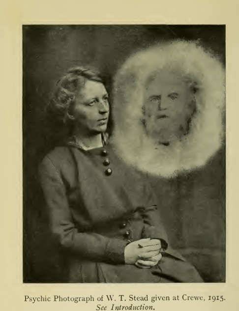 Stead spent much of his time in a building that was like a spiritual telecommunications hub where souls could contact mediums on the earthly plane and either appear before them as ghosts or send them messages. There he managed to telepath his face on to spirit photo, which I think is probably referring to the one below, taken in Crewe in 1913 or 1914.