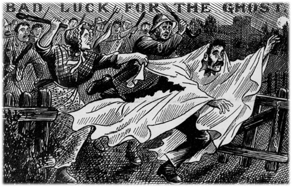 This bizarre pass time was called ‘playing the ghost’ and was a regular occurrence. Often it would lead to mass impromptu drunken ghost hunts where revellers and the curious gathered to catch, see or at least talk about the ghost. Sometimes it would lead to angry mobs rioting drunkenly through the streets. It would often lead to copycat hoaxers who would carry out similar pranks as well as to opportunistic ‘victims’ who would fabricate encounters with the Ghost and then harvest the attention and sympathy as they languished melodramatically suffering from the shock. People would be scared to go out.[ii]